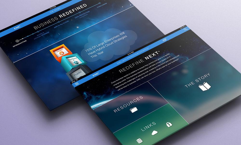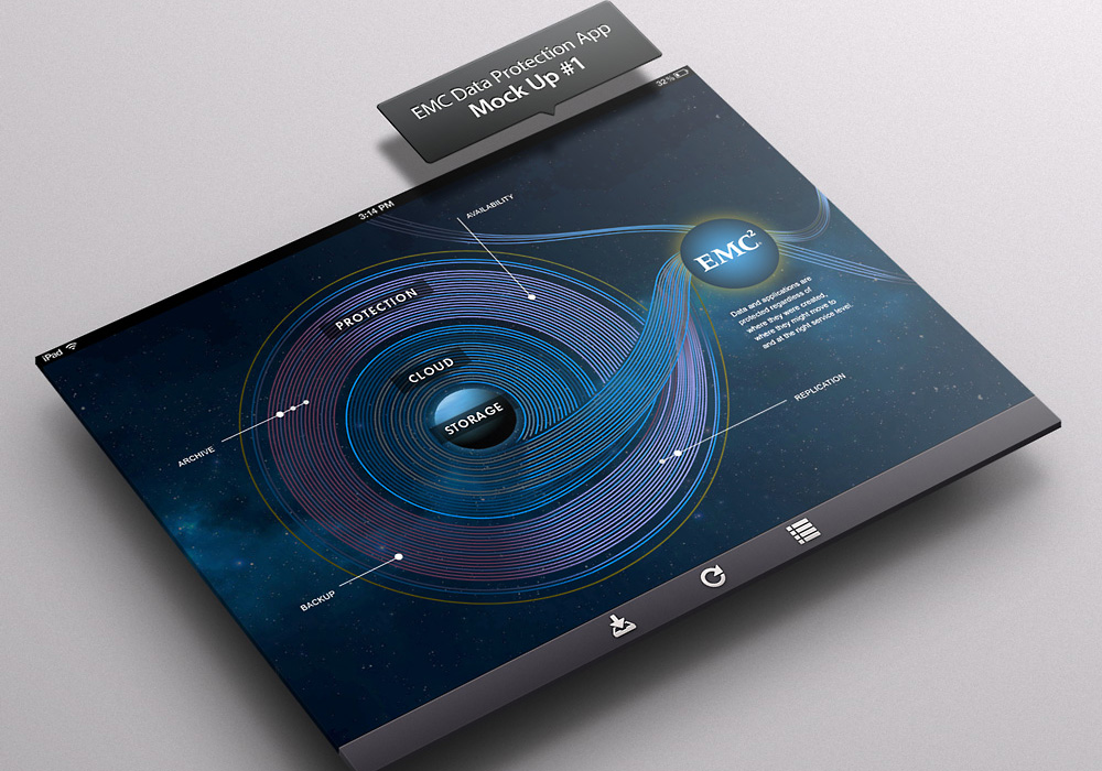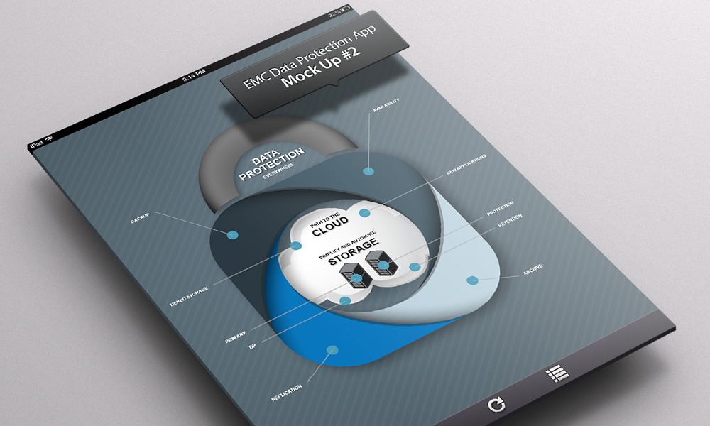 Shown here are various mobile apps as well as some interactive applications for clients such as EMC (now Dell EMC) and Mahalo Digital. Here is a brief description of each: (1) An internal iPad app for EMC sales reps to showcase the advatnages of EMC's Data Protection Strategy. (2) Mockup of a mobile presentation app for Mahalo Digital. (3 & 4) Several early design mockups of the EMC Data Protection app. (5) An interactive PDF displaying videos, info and interactive content for EMC's award winning storage software and suites.