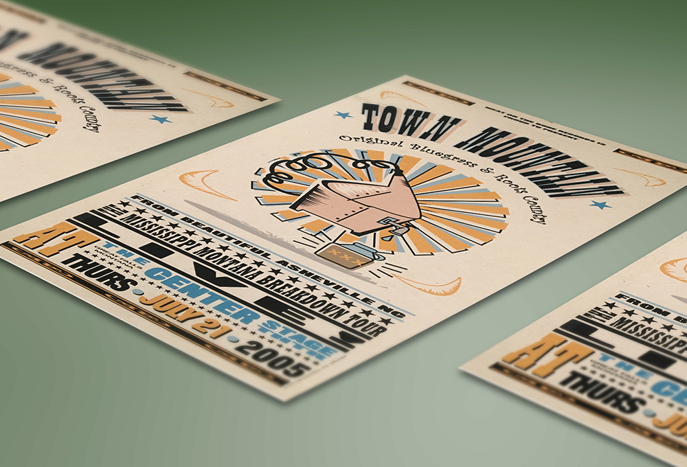 Town Mountain has earned raves for their hard-driving sound, their in-house songwriting and the honky-tonk edge that permeates their exhilarating live performances, whether in a packed club or at a sold-out festival. I was asked to come up with a promotional poster that captured their rawness as well as their down home country roots. These posters were printed on my local high-end Iris printer in batches of 50 so that each batch could be sent out & individualized for each venue to over 15 cities throughout the West coast. Each with its own date and venue information.