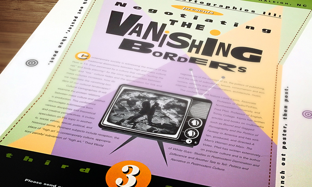 Poster for national graduate student pop culture conference entitled "Negotiating the Vanishing Borders" for the North Carolina State University graduate program. The conference focused on media issues and intertextuality. The posters, which were perforated along the outer edges, were a big hit. Many posters were detached and perforated, leaving only the outer edges, which displayed where to find inforamtion on the event in case of missing poster. This also played into the "Vanishing Borders" theme.