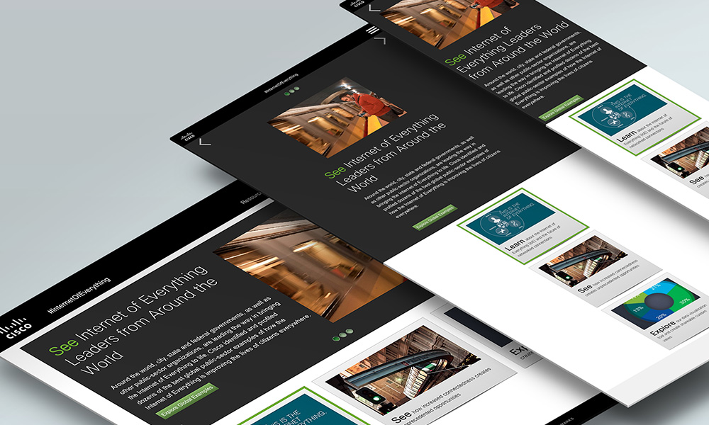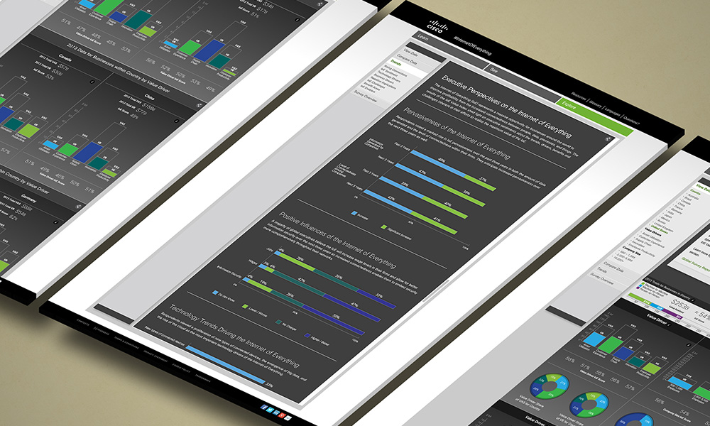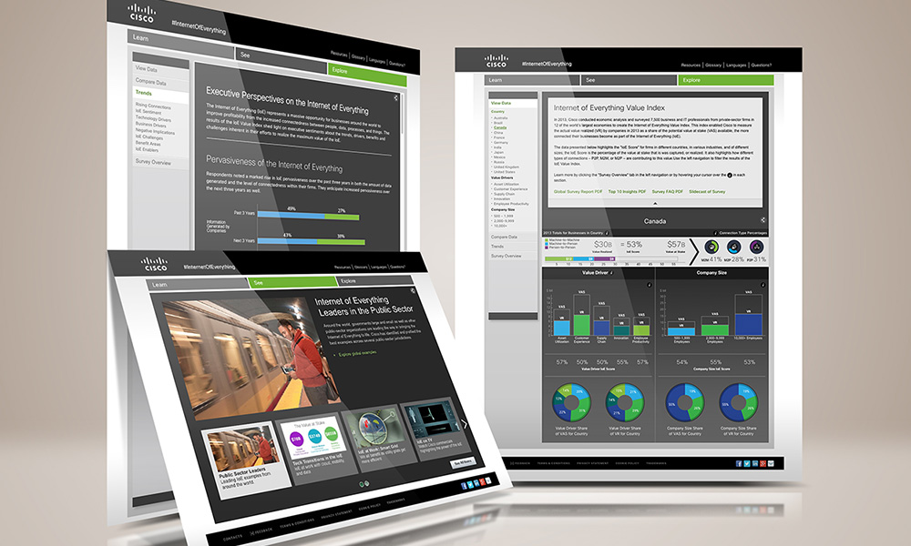 Cisco defined the Internet of Everything (IoE) as bringing together people, process, data, and things to make networked connections more relevant and valuable than ever before. The IOE website captures the essence of this by showcasing the IOE into 3 areas: Learn, See and Explore, where a full interactive experience awaits the user where they can see and interact with data that Cisco has collected over the years showcasing how IOE effects businesses, countries and consumers all over the world.